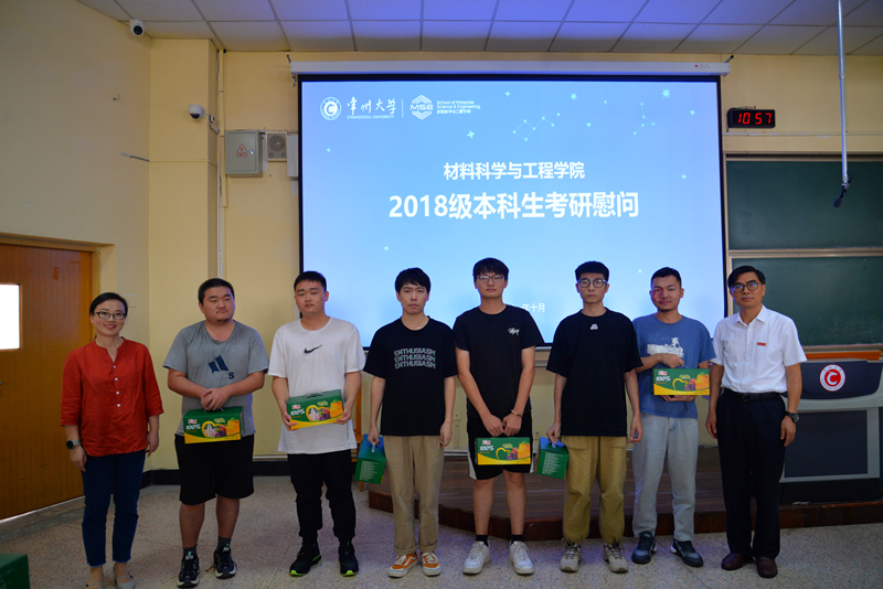 为增强大四考研学生的信心,舒缓考研学子的心理压力,材料学院于10月3日上午在W6阶举行了2018级本科生考研慰问会。院长朱卫国,党委副书记程晓军,副院长张洪文,学院校友、华研教育负责人董洪彬,各专业辅导员以及2018级各专业考研学生参加了大会。 张洪文首先讲解了常大的专业排名,专业未来发展与历史进程,详细讲述了我校科研师资力量,教学平台,研究成果,对学生的未来培养等,并积极鼓励学生报名本校。学院材化102班毕业生、华研教育负责人董洪彬为大家详细地分析了选择院校的重要性,举例各高校历年录取人数、调剂人数、最终报考率,为同学们介绍选择院校时需注意的要点。毕业班辅导员则为同学们送上了细致的祝福。程晓军鼓励大家努力学习、积极备考,通过介绍慰问品汇源果汁的寓意,祝愿学生学会融会贯通,成功上岸。朱卫国总结发言,他补充了学院发展前景、优异研究成果以及报考本校的优势,鼓励学生可优先考虑本校,表达了对学生考研上岸的祝福,希望大家认真准备、一路凯歌。最后院领导、辅导员为同学们发放了慰问品。 此次的活动,不仅体现了材料学院对于考研工作的高度重视,还使考研学生感受到学院的关心和鼓励,增加了全体考研学生的信心。望所有考研学生不负所望,成功上岸。