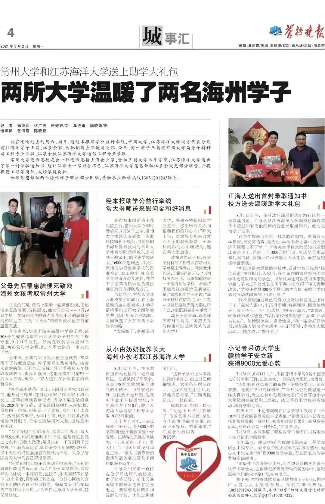 王莉同学为常州大学2021级连云港籍新生,现就读于常州大学材料科学与工程学院高分子专业。因父母先后遭遇重病导致家庭困难,现仅依靠当地的残疾补贴与母亲开残疾车的微薄收入维持家庭开支。王莉同学平日在完成自己学业的同时,分担家务并通过做家教补贴家用。家庭的重担并未影响这位励志女孩追求梦想的步伐,2021年8月,王莉同学以优异的成绩考取常州大学材料科学与工程学院高分子专业。连云港《苍梧晚报》的“公益行”活动得知该生的情况后,与学校宣传部、学生处、校友办取得联系,相关部门负责人高度重视,快速组织了对该生的帮扶工作。学生处、材料科学与工程学院委托连云港招生组咸东进老师第一时间送上了6000元贫困学生慰问金,并告知她生源地贷款和学校的困难补助、勤工俭学、社会奖学金申请等政策的内容与申请方式以及相关业务负责人的联系方式。校友办联络常州大学连云港校友会,告知王莉同学的相关情况,当地校友会迅速组织对王莉校友的帮扶工作,韩江龙会长代表连云港校友会上门看望,表达关心鼓励的同时个人出资5000元表示慰问。连云港籍女企业家刘祥校友,对其四年的学费与住宿费进行了资助。10月,王莉来到了她心仪已久的常州大学,材料科学与工程学院对于这位自强不息的女孩给予了生活与学习上无微不至的关怀。 在这样一个炙热的夏天,比温度更加炙热的是来自母校对每一位常大学子的关爱,是来自校友之间醇厚情谊的传承,更是来自于这位自强励志女孩对残酷生活的微笑直面、顽强奋斗。他们共同演绎了一群常大人的爱心流动,共同诠释了一代代常大人对于“责任”的共同理解。