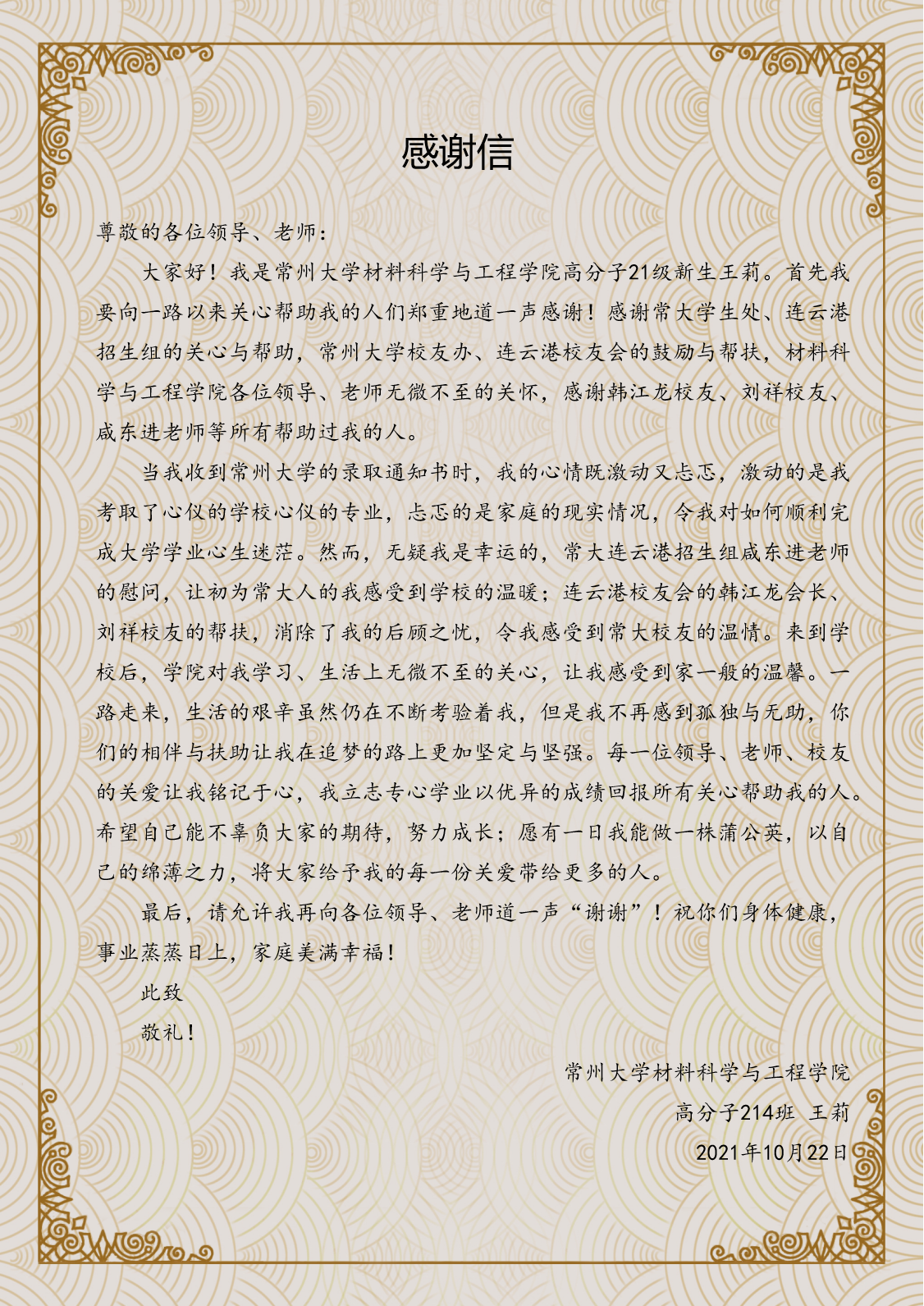 | 来自材料学院新生同学的一封感谢信 |