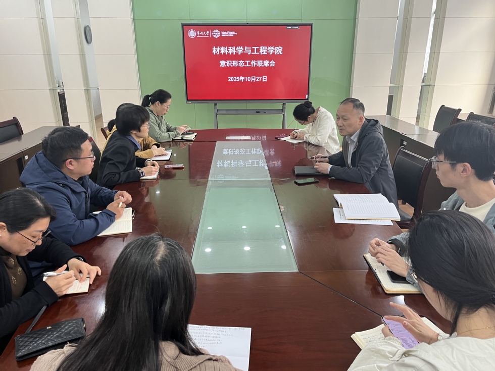 | 2025年10月27日下午,材料学院党委在材料楼406会议室召开第三季度意识形态工作联席会。学院党委书记储志新、全体科级干部和党支部书记参加会议。 各科级干部和党支部书记依次就分管领域及所在支部近期开展的意识形态工作、存在的问题和发现的风险隐患及整改建议进行了交流发言。 储志新强调,当前意识形态工作复杂多变,风险挑战不容忽视,大家要持续深化理论武装,筑牢意识形态安全防线,抓牢关键环节,守好重点阵地,维护好校园安全稳定。